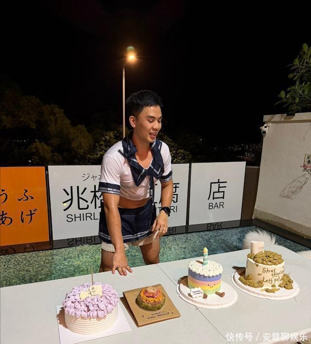 这场庆生派对以电影《头文字D》作为主题。为了博太太一笑,伍富桥也是拼了,反串电影中女主角“茂木夏树”,穿上了经典蓝白色水手服校服裙,一出场就掀起派对高潮。